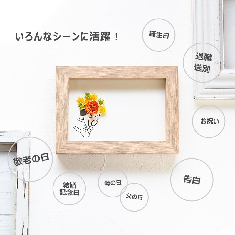 お誕生日やおめでとうの気持ちを伝えたいけど、メールじゃそっけないしお花を贈るのは大げさだし・・・何てことありませんか?そんな時に活躍してくれるのがこのグリーティングフレーム!お花を贈りたい気持ちと届けたい言葉をフレームに閉じ込めました。