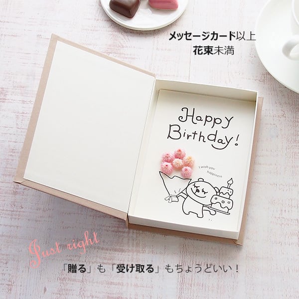 お誕生日 おめでとうの気持ちを伝えたいけど、メールじゃそっけないしお花を贈るのは大げさだし・・・何てことありませんか?そんな時に活躍してくれるのがこのバースデーカード!お花を贈りたい気持ちと届けたい言葉をボックスに閉じ込めました。