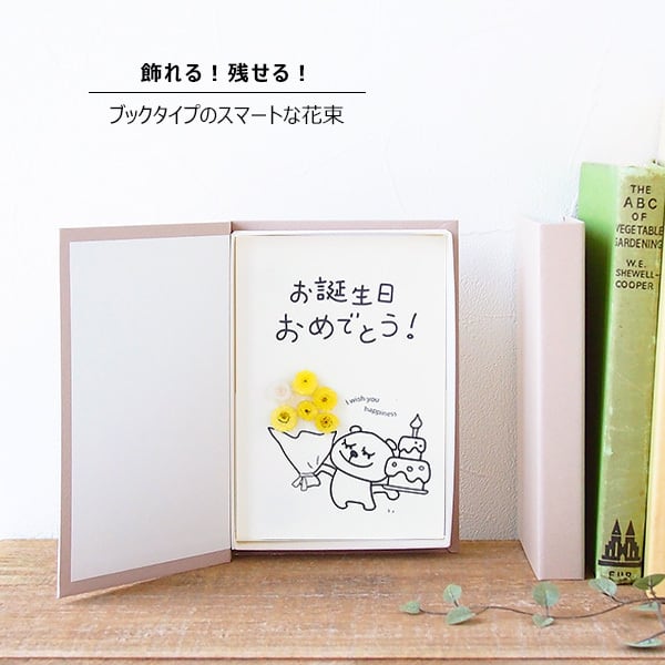 自然素材のお花でデコレーションしたグリーティングカード。ふっくら分厚いブック型のボックスタイプなのでもらった後に飾ることができる贅沢なメッセージカードです!